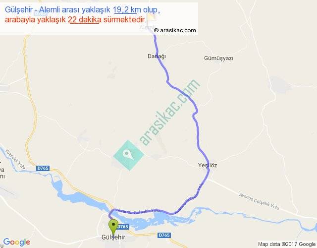 Gülşehir - Alemli arası yaklaşık olarak 90 km/h ile yukarıda belirtilen sürede olup, iki yerin kuş uçuşu uzaklığı (mesafesi) 13'dir. Yolculuk otobüsle 28 dakika sürmektedir.