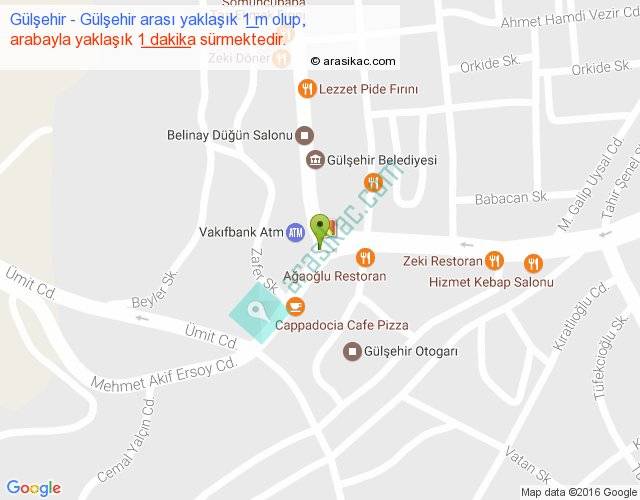 Gülşehir - Gülşehir arası yaklaşık olarak 90 km/h ile yukarıda belirtilen sürede olup, iki yerin kuş uçuşu uzaklığı (mesafesi) 0'dir. Yolculuk otobüsle 1 dakika sürmektedir.