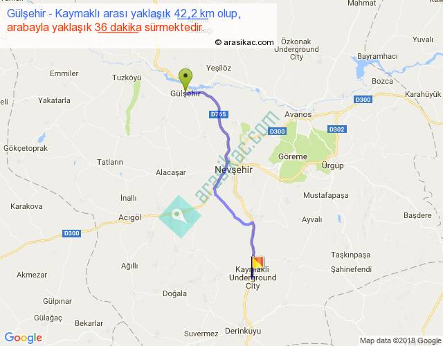 Gülşehir - Kaymaklı arası yaklaşık olarak 90 km/h ile yukarıda belirtilen sürede olup, iki yerin kuş uçuşu uzaklığı (mesafesi) 34'dir. Yolculuk otobüsle 46 dakika sürmektedir.