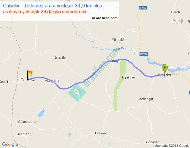 Gülşehir - Terlemez arası yaklaşık olarak 90 km/h ile yukarıda belirtilen sürede olup, iki yerin kuş uçuşu uzaklığı (mesafesi) 27'dir. Yolculuk otobüsle 37 dakika sürmektedir.