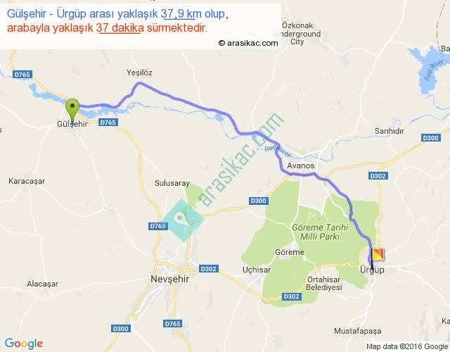 Gülşehir - Ürgüp arası yaklaşık olarak 90 km/h ile yukarıda belirtilen sürede olup, iki yerin kuş uçuşu uzaklığı (mesafesi) 28'dir. Yolculuk otobüsle 48 dakika sürmektedir.