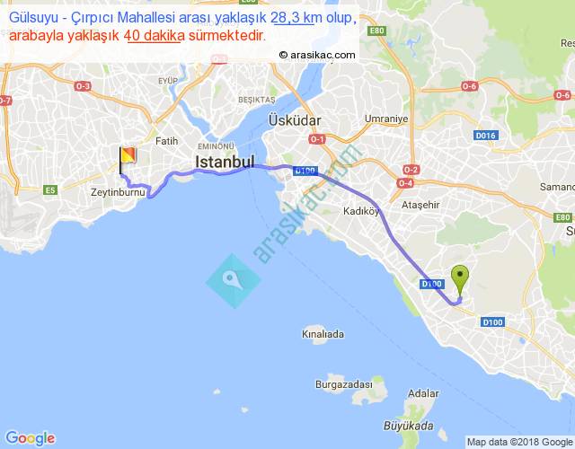 Gülsuyu - Çırpıcı Mahallesi arası yaklaşık olarak 90 km/h ile yukarıda belirtilen sürede olup, iki yerin kuş uçuşu uzaklığı (mesafesi) 23'dir. Yolculuk otobüsle 52 dakika sürmektedir.
