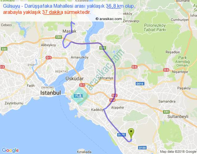 Gülsuyu - Darüşşafaka Mahallesi arası yaklaşık olarak 90 km/h ile yukarıda belirtilen sürede olup, iki yerin kuş uçuşu uzaklığı (mesafesi) 24'dir. Yolculuk otobüsle 48 dakika sürmektedir.