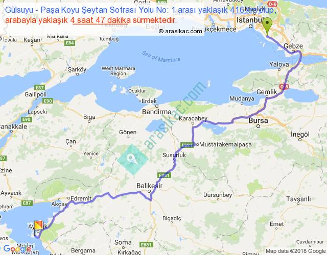 Gülsuyu - Paşa Koyu Şeytan Sofrası Yolu No: 1 arası yaklaşık olarak 90 km/h ile yukarıda belirtilen sürede olup, iki yerin kuş uçuşu uzaklığı (mesafesi) 279'dir. Eğer belirtilen yerler arasında uçak seferi var ise bu süre uçakla 25 dakika'ya kadar düşebilir. Yolculuk otobüsle 6 saat 13 dakika sürmektedir.