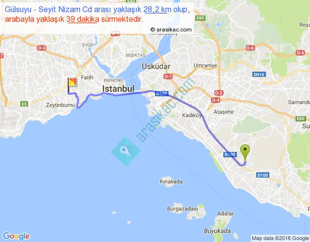 Gülsuyu - Seyit Nizam Cd arası yaklaşık olarak 90 km/h ile yukarıda belirtilen sürede olup, iki yerin kuş uçuşu uzaklığı (mesafesi) 22'dir. Yolculuk otobüsle 50 dakika sürmektedir.