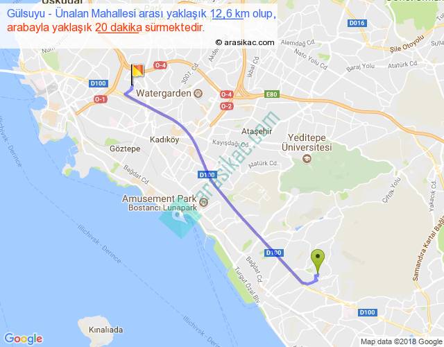 Gülsuyu - Ünalan Mahallesi arası yaklaşık olarak 90 km/h ile yukarıda belirtilen sürede olup, iki yerin kuş uçuşu uzaklığı (mesafesi) 11'dir. Yolculuk otobüsle 26 dakika sürmektedir.