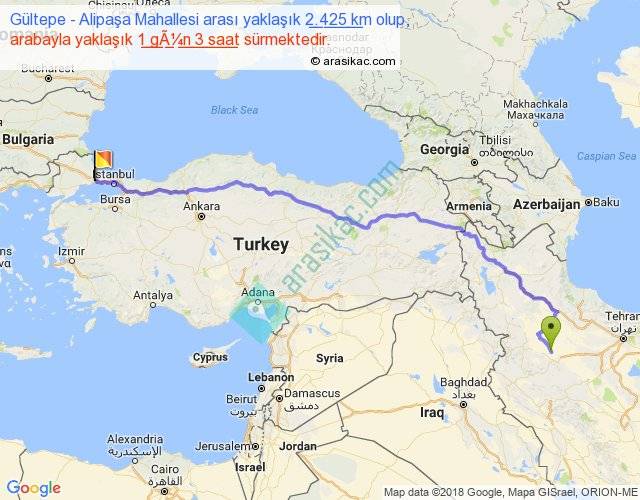 Gültepe - Alipaşa Mahallesi arası yaklaşık olarak 90 km/h ile yukarıda belirtilen sürede olup, iki yerin kuş uçuşu uzaklığı (mesafesi) 1851'dir. Eğer belirtilen yerler arasında uçak seferi var ise bu süre uçakla 2 saat 50 dakika'ya kadar düşebilir. Yolculuk otobüsle 1 gün 11 saat sürmektedir.