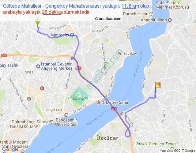 Gültepe Mahallesi - Çengelköy Mahallesi arası yaklaşık olarak 90 km/h ile yukarıda belirtilen sürede olup, iki yerin kuş uçuşu uzaklığı (mesafesi) 6'dir. Yolculuk otobüsle 36 dakika sürmektedir.