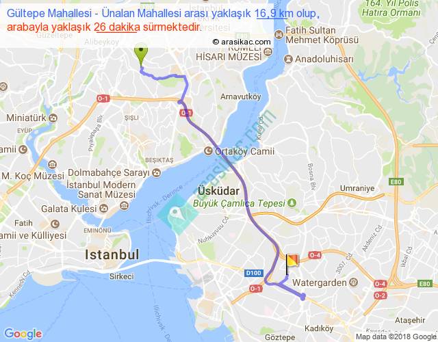 Gültepe Mahallesi - Ünalan Mahallesi arası yaklaşık olarak 90 km/h ile yukarıda belirtilen sürede olup, iki yerin kuş uçuşu uzaklığı (mesafesi) 11'dir. Yolculuk otobüsle 33 dakika sürmektedir.