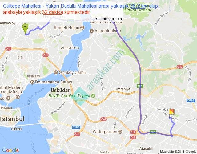 Gültepe Mahallesi - Yukarı Dudullu Mahallesi arası yaklaşık olarak 90 km/h ile yukarıda belirtilen sürede olup, iki yerin kuş uçuşu uzaklığı (mesafesi) 15'dir. Yolculuk otobüsle 41 dakika sürmektedir.