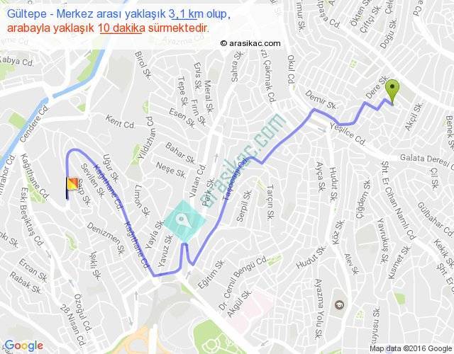 Gültepe - Merkez arası yaklaşık olarak 90 km/h ile yukarıda belirtilen sürede olup, iki yerin kuş uçuşu uzaklığı (mesafesi) 2'dir. Yolculuk otobüsle 13 dakika sürmektedir.