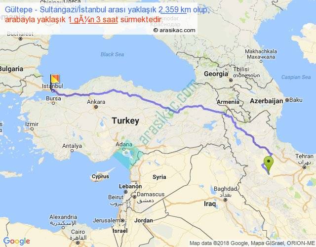Gültepe - Sultangazi İstanbul arası yaklaşık olarak 90 km/h ile yukarıda belirtilen sürede olup, iki yerin kuş uçuşu uzaklığı (mesafesi) 1798'dir. Eğer belirtilen yerler arasında uçak seferi var ise bu süre uçakla 2 saat 45 dakika'ya kadar düşebilir. Yolculuk otobüsle 1 gün 11 saat sürmektedir.