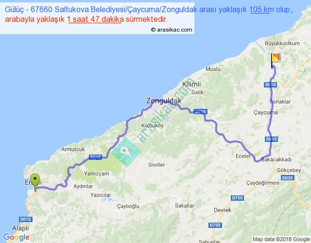 Gülüç - 67660 Saltukova Belediyesi Çaycuma Zonguldak arası yaklaşık olarak 90 km/h ile yukarıda belirtilen sürede olup, iki yerin kuş uçuşu uzaklığı (mesafesi) 62'dir. Yolculuk otobüsle 2 saat 19 dakika sürmektedir.