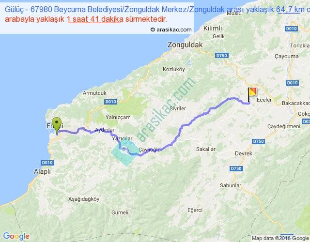 Gülüç - 67980 Beycuma Belediyesi Zonguldak Merkez Zonguldak arası yaklaşık olarak 90 km/h ile yukarıda belirtilen sürede olup, iki yerin kuş uçuşu uzaklığı (mesafesi) 46'dir. Yolculuk otobüsle 2 saat 11 dakika sürmektedir.