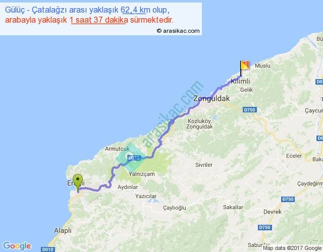 Gülüç - Çatalağzı arası yaklaşık olarak 90 km/h ile yukarıda belirtilen sürede olup, iki yerin kuş uçuşu uzaklığı (mesafesi) 45'dir. Yolculuk otobüsle 2 saat 6 dakika sürmektedir.