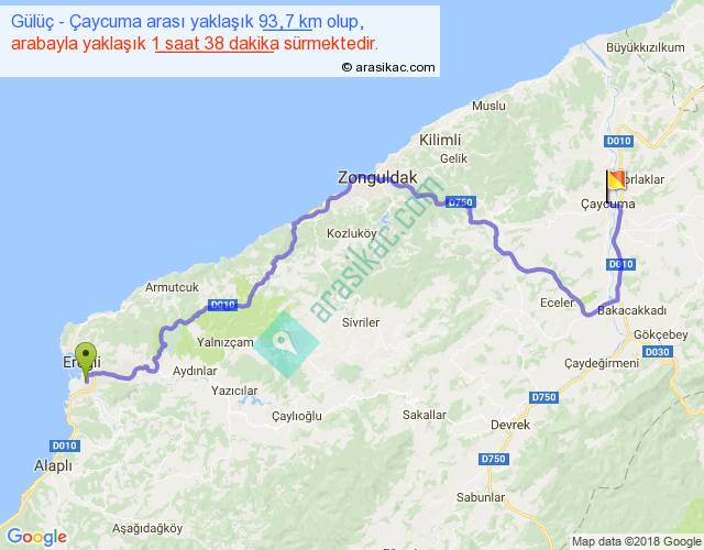 Gülüç - Çaycuma arası yaklaşık olarak 90 km/h ile yukarıda belirtilen sürede olup, iki yerin kuş uçuşu uzaklığı (mesafesi) 57'dir. Yolculuk otobüsle 2 saat 7 dakika sürmektedir.