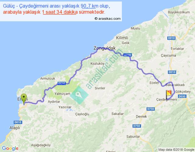 Gülüç - Çaydeğirmeni arası yaklaşık olarak 90 km/h ile yukarıda belirtilen sürede olup, iki yerin kuş uçuşu uzaklığı (mesafesi) 53'dir. Yolculuk otobüsle 2 saat 2 dakika sürmektedir.