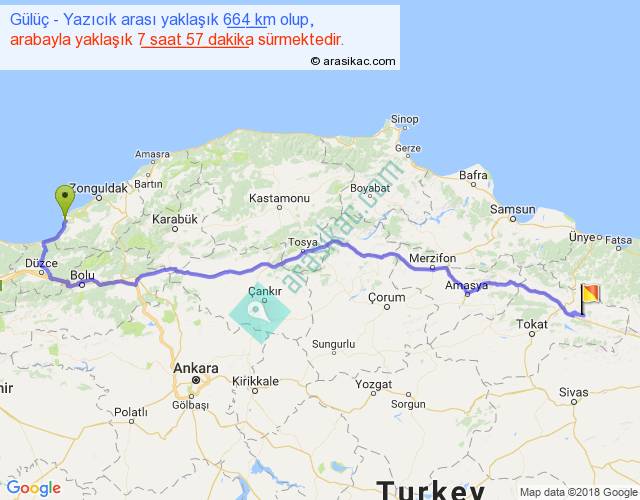 Gülüç - Yazıcık arası yaklaşık olarak 90 km/h ile yukarıda belirtilen sürede olup, iki yerin kuş uçuşu uzaklığı (mesafesi) 483'dir. Eğer belirtilen yerler arasında uçak seferi var ise bu süre uçakla 44 dakika'ya kadar düşebilir. Yolculuk otobüsle 10 saat 20 dakika sürmektedir.