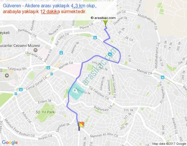 Gülveren - Akdere arası yaklaşık olarak 90 km/h ile yukarıda belirtilen sürede olup, iki yerin kuş uçuşu uzaklığı (mesafesi) 3'dir. Yolculuk otobüsle 15 dakika sürmektedir.