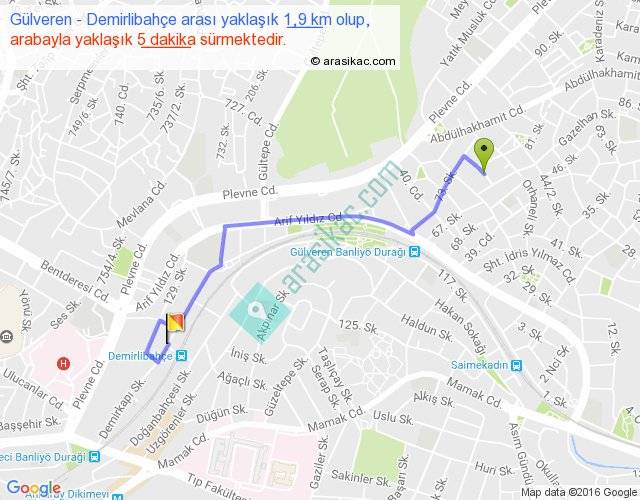 Gülveren - Demirlibahçe arası yaklaşık olarak 90 km/h ile yukarıda belirtilen sürede olup, iki yerin kuş uçuşu uzaklığı (mesafesi) 1'dir. Yolculuk otobüsle 6 dakika sürmektedir.
