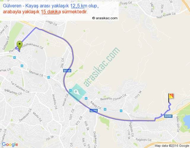 Gülveren - Kayaş arası yaklaşık olarak 90 km/h ile yukarıda belirtilen sürede olup, iki yerin kuş uçuşu uzaklığı (mesafesi) 8'dir. Yolculuk otobüsle 19 dakika sürmektedir.