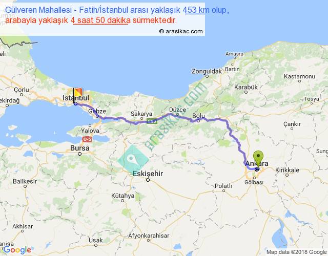 Gülveren Mahallesi - Fatih İstanbul arası yaklaşık olarak 90 km/h ile yukarıda belirtilen sürede olup, iki yerin kuş uçuşu uzaklığı (mesafesi) 352'dir. Eğer belirtilen yerler arasında uçak seferi var ise bu süre uçakla 32 dakika'ya kadar düşebilir. Yolculuk otobüsle 6 saat 17 dakika sürmektedir.