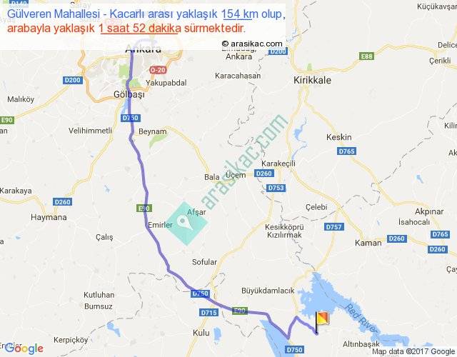 Gülveren Mahallesi - Kacarlı arası yaklaşık olarak 90 km/h ile yukarıda belirtilen sürede olup, iki yerin kuş uçuşu uzaklığı (mesafesi) 109'dir. Yolculuk otobüsle 2 saat 25 dakika sürmektedir.