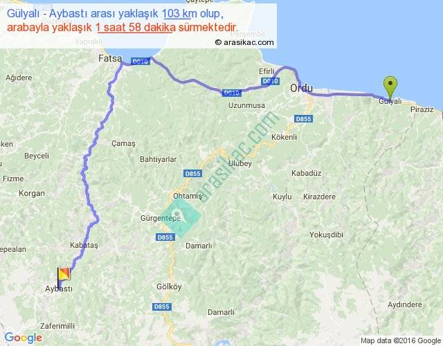 Gülyalı - Aybastı arası yaklaşık olarak 90 km/h ile yukarıda belirtilen sürede olup, iki yerin kuş uçuşu uzaklığı (mesafesi) 63'dir. Yolculuk otobüsle 2 saat 33 dakika sürmektedir.