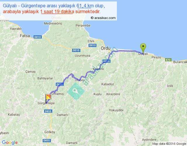 Gülyalı - Gürgentepe arası yaklaşık olarak 90 km/h ile yukarıda belirtilen sürede olup, iki yerin kuş uçuşu uzaklığı (mesafesi) 43'dir. Yolculuk otobüsle 1 saat 42 dakika sürmektedir.