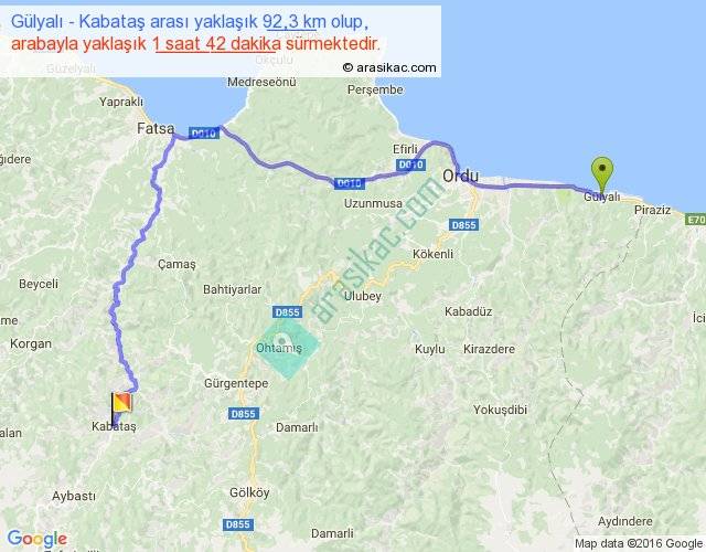 Gülyalı - Kabataş arası yaklaşık olarak 90 km/h ile yukarıda belirtilen sürede olup, iki yerin kuş uçuşu uzaklığı (mesafesi) 56'dir. Yolculuk otobüsle 2 saat 12 dakika sürmektedir.