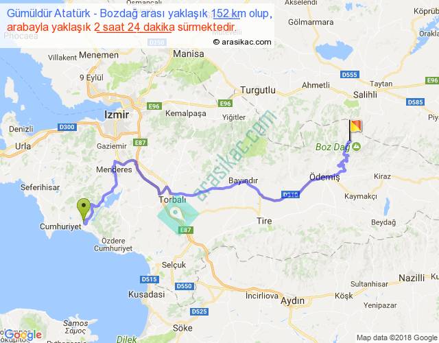 Gümüldür Atatürk - Bozdağ arası yaklaşık olarak 90 km/h ile yukarıda belirtilen sürede olup, iki yerin kuş uçuşu uzaklığı (mesafesi) 97'dir. Yolculuk otobüsle 3 saat 7 dakika sürmektedir.