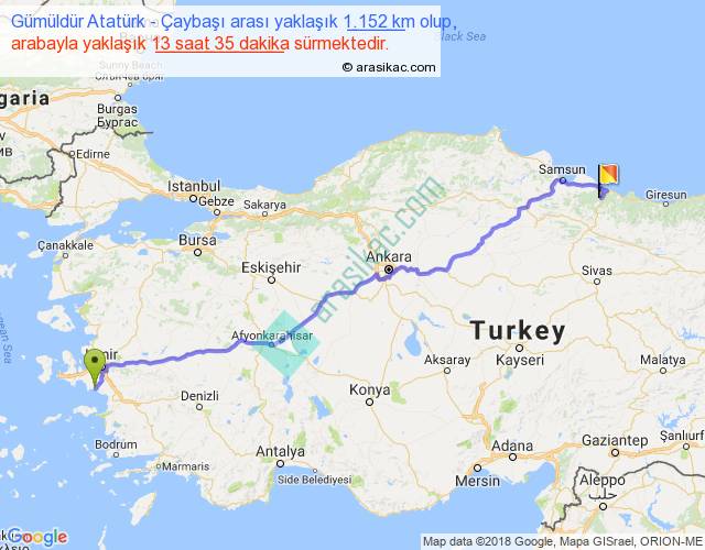 Gümüldür Atatürk - Çaybaşı arası yaklaşık olarak 90 km/h ile yukarıda belirtilen sürede olup, iki yerin kuş uçuşu uzaklığı (mesafesi) 918'dir. Eğer belirtilen yerler arasında uçak seferi var ise bu süre uçakla 1 saat 24 dakika'ya kadar düşebilir. Yolculuk otobüsle 17 saat 39 dakika sürmektedir.