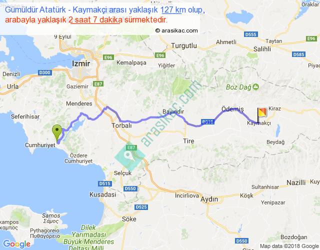 Gümüldür Atatürk - Kaymakçi arası yaklaşık olarak 90 km/h ile yukarıda belirtilen sürede olup, iki yerin kuş uçuşu uzaklığı (mesafesi) 97'dir. Yolculuk otobüsle 2 saat 45 dakika sürmektedir.