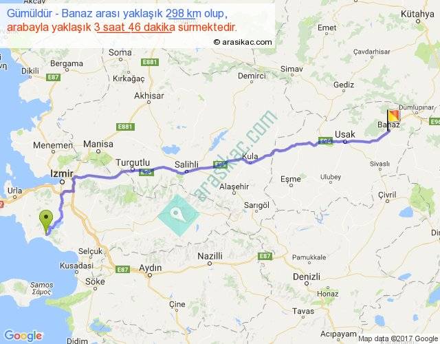 Gümüldür - Banaz arası yaklaşık olarak 90 km/h ile yukarıda belirtilen sürede olup, iki yerin kuş uçuşu uzaklığı (mesafesi) 247'dir. Yolculuk otobüsle 4 saat 53 dakika sürmektedir.