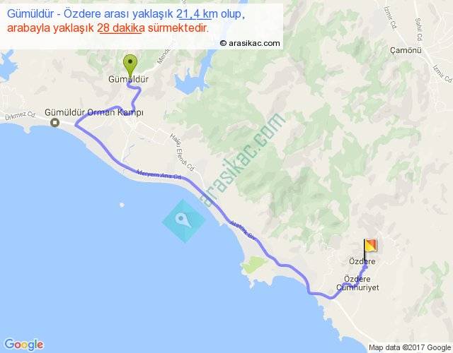 Gümüldür - Özdere arası yaklaşık olarak 90 km/h ile yukarıda belirtilen sürede olup, iki yerin kuş uçuşu uzaklığı (mesafesi) 13'dir. Yolculuk otobüsle 36 dakika sürmektedir.