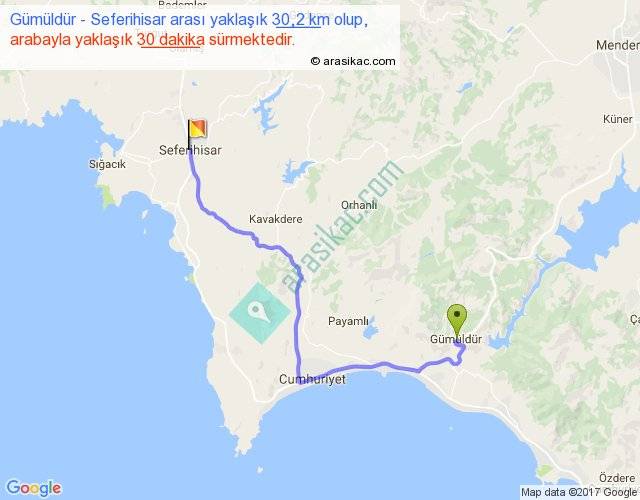Gümüldür - Seferihisar arası yaklaşık olarak 90 km/h ile yukarıda belirtilen sürede olup, iki yerin kuş uçuşu uzaklığı (mesafesi) 20'dir. Yolculuk otobüsle 39 dakika sürmektedir.