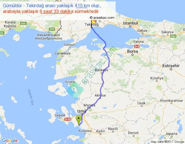 Gümüldür - Tekirdağ arası yaklaşık olarak 90 km/h ile yukarıda belirtilen sürede olup, iki yerin kuş uçuşu uzaklığı (mesafesi) 322'dir. Eğer belirtilen yerler arasında uçak seferi var ise bu süre uçakla 29 dakika'ya kadar düşebilir. Yolculuk otobüsle 8 saat 30 dakika sürmektedir.