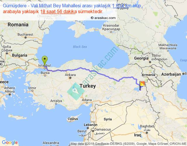Gümüşdere - Vali Mithat Bey Mahallesi arası yaklaşık olarak 90 km/h ile yukarıda belirtilen sürede olup, iki yerin kuş uçuşu uzaklığı (mesafesi) 1258'dir. Eğer belirtilen yerler arasında uçak seferi var ise bu süre uçakla 1 saat 56 dakika'ya kadar düşebilir. Yolculuk otobüsle 1 gün 0 saat sürmektedir.