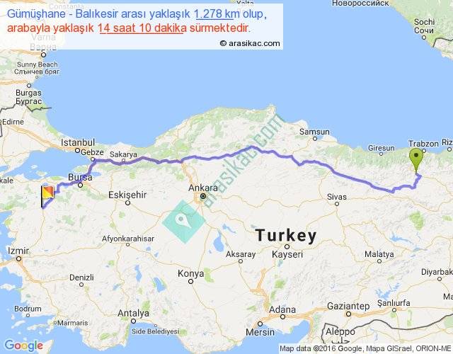 Gümüşhane - Balıkesir arası yaklaşık olarak 90 km/h ile yukarıda belirtilen sürede olup, iki yerin kuş uçuşu uzaklığı (mesafesi) 984'dir. Eğer belirtilen yerler arasında uçak seferi var ise bu süre uçakla 1 saat 30 dakika'ya kadar düşebilir. Yolculuk otobüsle 18 saat 25 dakika sürmektedir.