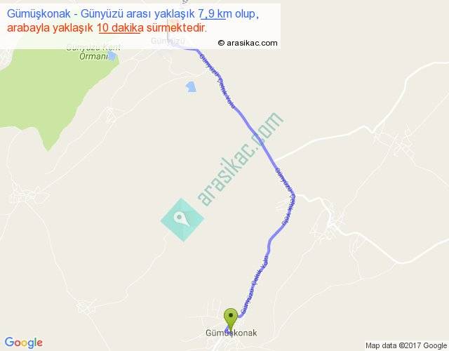 Gümüşkonak - Günyüzü arası yaklaşık olarak 90 km/h ile yukarıda belirtilen sürede olup, iki yerin kuş uçuşu uzaklığı (mesafesi) 6'dir. Yolculuk otobüsle 13 dakika sürmektedir.