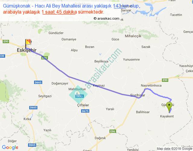 Gümüşkonak - Hacı Ali Bey Mahallesi arası yaklaşık olarak 90 km/h ile yukarıda belirtilen sürede olup, iki yerin kuş uçuşu uzaklığı (mesafesi) 122'dir. Yolculuk otobüsle 2 saat 16 dakika sürmektedir.