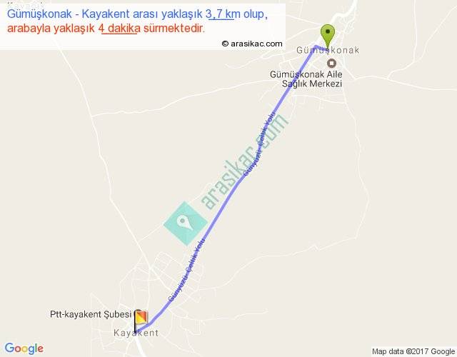 Gümüşkonak - Kayakent arası yaklaşık olarak 90 km/h ile yukarıda belirtilen sürede olup, iki yerin kuş uçuşu uzaklığı (mesafesi) 4'dir. Yolculuk otobüsle 5 dakika sürmektedir.
