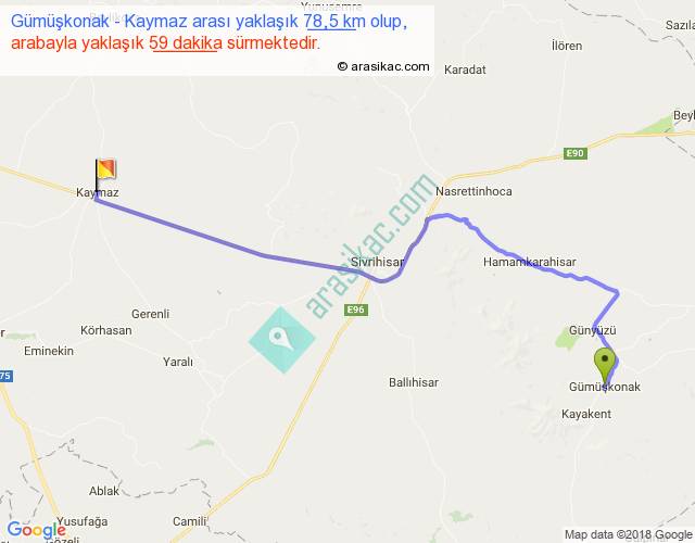 Gümüşkonak - Kaymaz arası yaklaşık olarak 90 km/h ile yukarıda belirtilen sürede olup, iki yerin kuş uçuşu uzaklığı (mesafesi) 59'dir. Yolculuk otobüsle 1 saat 16 dakika sürmektedir.