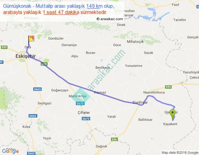 Gümüşkonak - Muttalip arası yaklaşık olarak 90 km/h ile yukarıda belirtilen sürede olup, iki yerin kuş uçuşu uzaklığı (mesafesi) 122'dir. Yolculuk otobüsle 2 saat 19 dakika sürmektedir.
