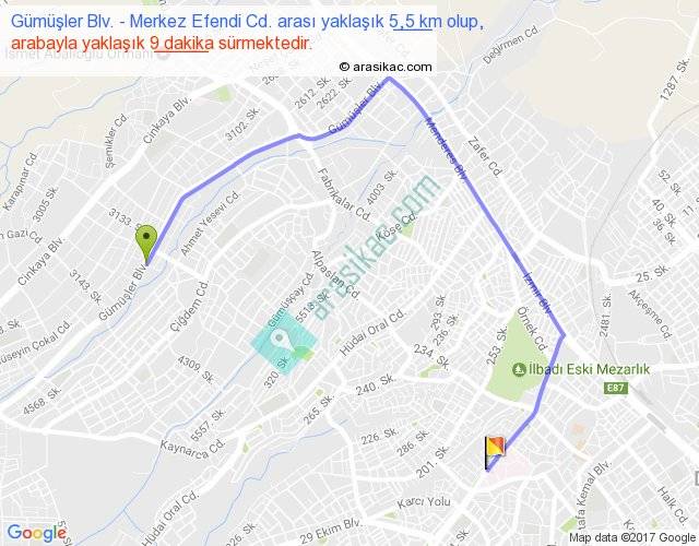 Gümüşler Blv. - Merkez Efendi Cd. arası yaklaşık olarak 90 km/h ile yukarıda belirtilen sürede olup, iki yerin kuş uçuşu uzaklığı (mesafesi) 3'dir. Yolculuk otobüsle 11 dakika sürmektedir.