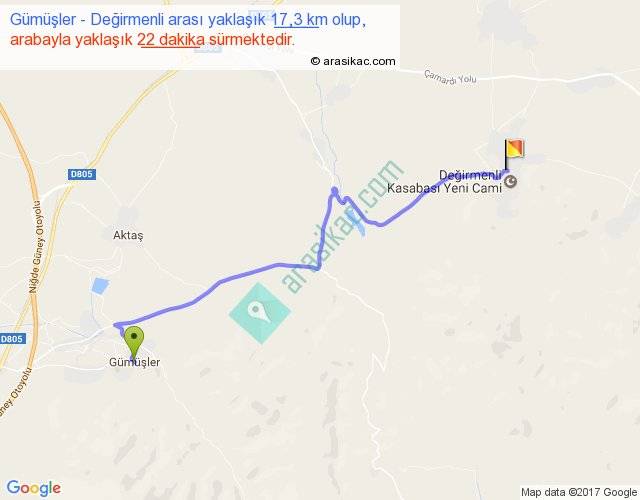 Gümüşler - Değirmenli arası yaklaşık olarak 90 km/h ile yukarıda belirtilen sürede olup, iki yerin kuş uçuşu uzaklığı (mesafesi) 13'dir. Yolculuk otobüsle 28 dakika sürmektedir.