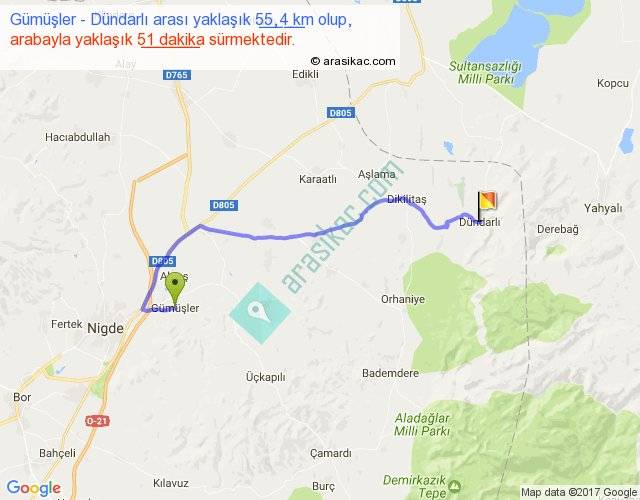 Gümüşler - Dündarlı arası yaklaşık olarak 90 km/h ile yukarıda belirtilen sürede olup, iki yerin kuş uçuşu uzaklığı (mesafesi) 38'dir. Yolculuk otobüsle 1 saat 6 dakika sürmektedir.