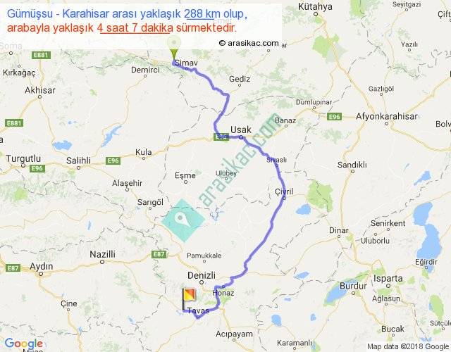 Gümüşsu - Karahisar arası yaklaşık olarak 90 km/h ile yukarıda belirtilen sürede olup, iki yerin kuş uçuşu uzaklığı (mesafesi) 169'dir. Yolculuk otobüsle 5 saat 21 dakika sürmektedir.
