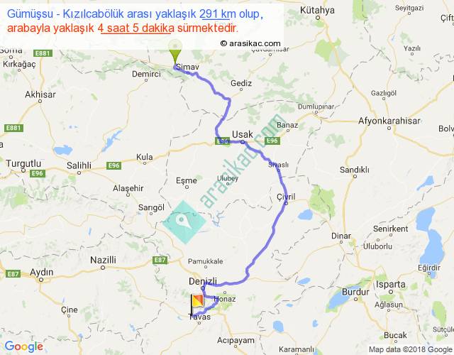 Gümüşsu - Kızılcabölük arası yaklaşık olarak 90 km/h ile yukarıda belirtilen sürede olup, iki yerin kuş uçuşu uzaklığı (mesafesi) 169'dir. Yolculuk otobüsle 5 saat 18 dakika sürmektedir.