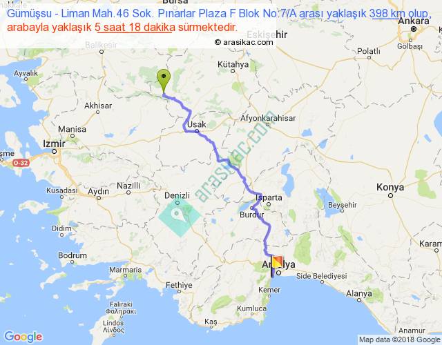 Gümüşsu - Liman Mah.46 Sok. Pınarlar Plaza F Blok No:7 A arası yaklaşık olarak 90 km/h ile yukarıda belirtilen sürede olup, iki yerin kuş uçuşu uzaklığı (mesafesi) 294'dir. Eğer belirtilen yerler arasında uçak seferi var ise bu süre uçakla 27 dakika'ya kadar düşebilir. Yolculuk otobüsle 6 saat 53 dakika sürmektedir.